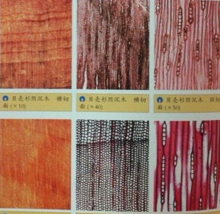 对贝壳杉阴沉木和现代木的木材解剖,贝壳杉的微观构造特征没有改变。木材中的各种细胞形态没有发生变化,只是细胞腔内的沉淀物明显增加。微观构造特征皆是:轴向管胞大小不一;早材管胞近圆形;管胞壁纹孔2列或2列以上。轴向薄壁组织偶见;呈星散状。射线细(肉眼下不见至可见);木射线非叠生;射线单列(偶2列),射线高5细胞以下;射线细胞方形或长方形。交叉场纹孔柏木型。